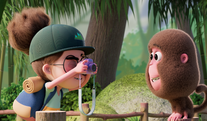 A girl tourist is practicing taking photos in the mountains when a monkey snatches her camera and runs away. The girl chases the monkey through the jungle, until unexpectedly the monkey asks the girl to take a family photo of her monkey family.