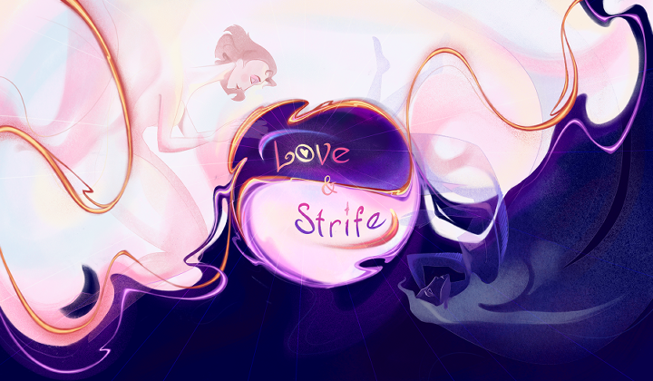 Born from a cosmic flower, Love creates life within a celestial lab, but grows lonely watching her creations thrive together. From a mirror she crafts, Strife, her reflection, emerges, bringing change that Love initially fears and tries to confine. When Strife breaks free, their clash leads to unity, igniting the Big Bang and beginning the universe’s eternal cycle.